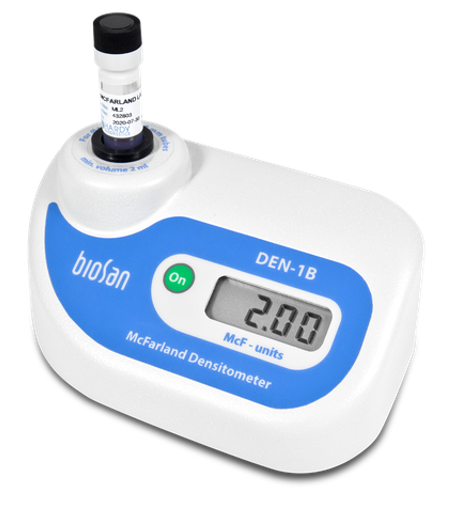 Densitometer is designed for measurement of cell suspension’s turbidity in the range of 0.0–6.0 McFarland units (0 – 180 × 107 cells/ml). Powered from external energy supply