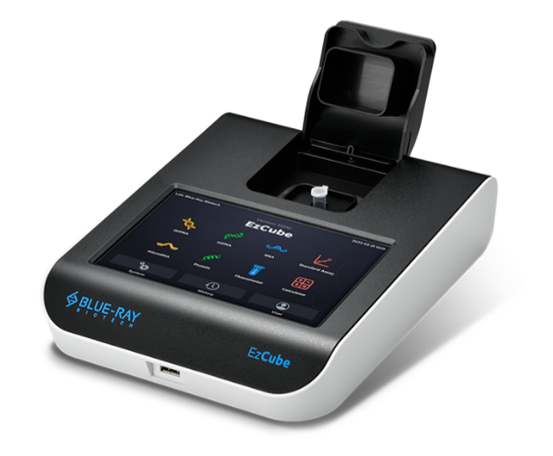 EzCube Fluorometer features three selectable fluorescent channels and offers high-sensitivity and specific quantification of nucleic acids and proteins. It accurately measures low concentration samples as small as 1 µl, making it ideal for demanding applications, including NGS. Combined with dedicated EzQuant quantification assays, an intuitive touchscreen and Wi-Fi connectivity, EzCube simplifies your precision quantification processes and makes them easy.